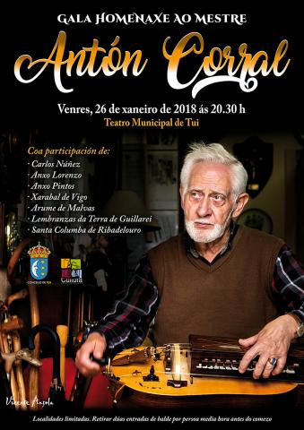 O Teatro Municipal de Tui acolle o venres, 26 de xaneiro, ás 20.30h a Gala Homenaxe ao Mestre Antón Corral. A entrada será de balde, debendo retirarse un máximo de dúas entradas por persoa dende ás 20h.