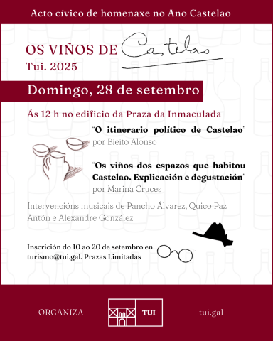 O domingo, 28 de setembro, ás 12 h no edificio da Praza da Inmaculada terá lugar o acto cívico de homenaxe no Ano Castelo "Os viños de Castelao", organizado polo Concello de Tui.