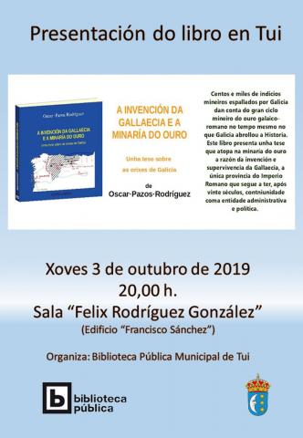 O xoves, 3 de outubro, ás 20 h na Sala Félix Rodríguez da Área Panorámica terá lugar a presentación do libro “A invención da Gallaecia e a minaría do ouro. Unha tese sobre as orixes de Galicia” de Óscar Pazos Rodríguez.