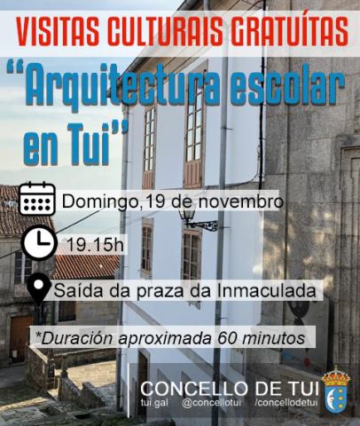 O sábado, 18 de novembro, 19.15h, sae dende a praza da Inmaculada unha nova visita cultural gratuíta para realizar un percorrido aproximado de 60 minutos pola “Arquitectura educativa en Tui”. Os asistentes a esta visita poderán coñecer o patrimonio educativo tudense vinculado aos edificios que se construíron con uso educativo durante o século XIX coma a Escola de Nenas e o Colexio de Primeiras Letras, ambos na rúa Sanz, o edificio dos Estudos de Gramática que actualmente ocupa o albergue de peregrinos, ou o Seminario Menor. O percorrido irá, tamén, por outras rúas con inmobles que aínda que foron construídos con outra finalidade tiveron igualmente uso escolar.