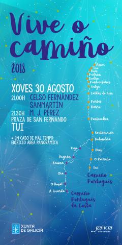O ciclo “Vive o Camiño” organizado polo Xacobeo recala en Tui, punto de entrada dos peregrinos a Galicia dende Portugal. O xoves, 30 de agosto, ás 21.00 h na Praza de San Fernando o poeta e contacontos Celso F.Sanmartin “Celsiño” achegará ao público relatos, historias e memorias vinculadas á tradición oral galega. Mentres a cantautora MJ Pérez na súa actuación fusionará estilos musicais nunha interpretación na que a súa voz, e mensaxe toman relevancia.