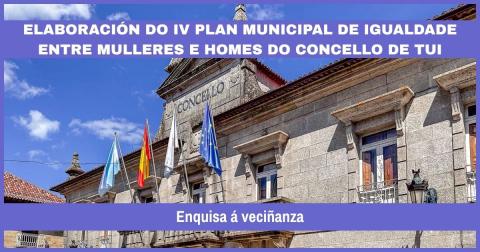 O Concello de Tui está elaborar o IV Plan de Igualdade entre mulleres e homes. Por este motivo é de gran importancia coñecer o parecer da veciñanza. Para iso agradecemos a contestación deste cuestionaro de forma anónima. Grazas pola colaboración!