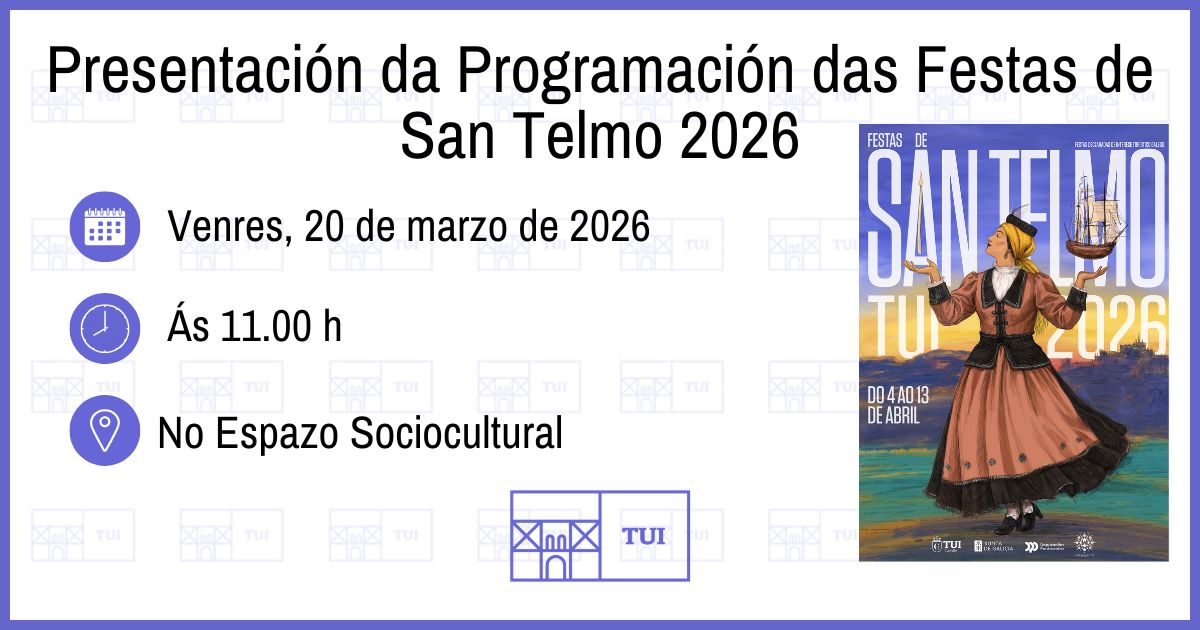 Este venres, 20 de marzo, ás 11 h no Espazo Sociocultural, na rúa Camilo José Cela, terá lugar a presentación da programación das Festas de San Telmo 2026 que se celebrará do 4 ao 13 de abril.