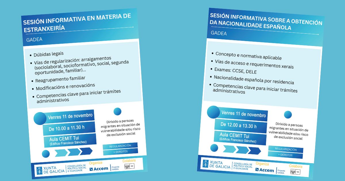 Vías de regularización, dúbidas legais, reagrupamento familiar, nacionalidade española por residencia, trámites administrativos... son algúns dos temas que se van abordar nas dúas sesións informativas que imparte Accem este venres 7 de novembro en Tui.
